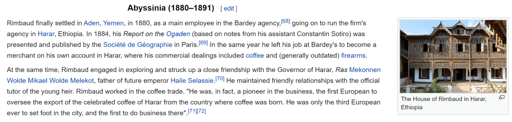 I jumped on Wikipedia to look up information on Arthur Rimbaud after reading a reference to Rimbaudian savagery. I’m somewhat of a Francophile and know a lot of things French and was a little surprised the name didn’t ring a bell. Happily I read through the entry filling a gaping hole of knowledge about a premier poet. But when I came to this section of the article the photo put my brain into a bell tower at high noon.