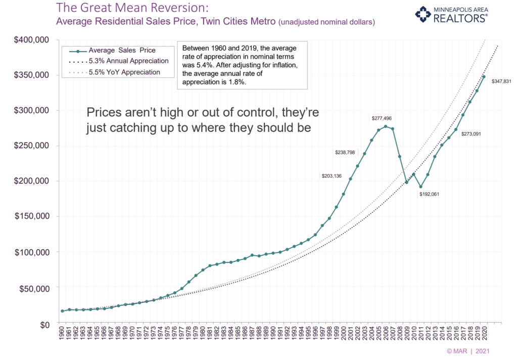 The data also shows a how housing prices are catching up to a long term trend rather than accelerating into a bubble.