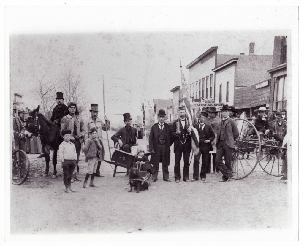 I love this old photo of my great great grandfather Anfinson at a political rally. He’s the one holding the flag. What a motley crew of citizens out and about supporting their favorite politicians. And lest you think there are no women involved in the political process, take a closer gander behind the mule to the left. A covey of proper women folk are gathered.