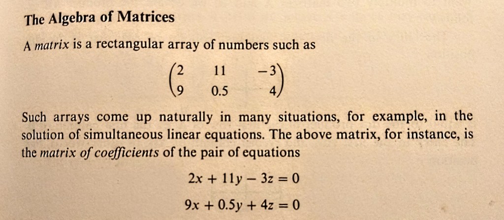 In mathematics a matrix is a grid of numbers, like an excel spread sheet. The numbers are arranged in such a way that they represent value descriptions for a variety of features.