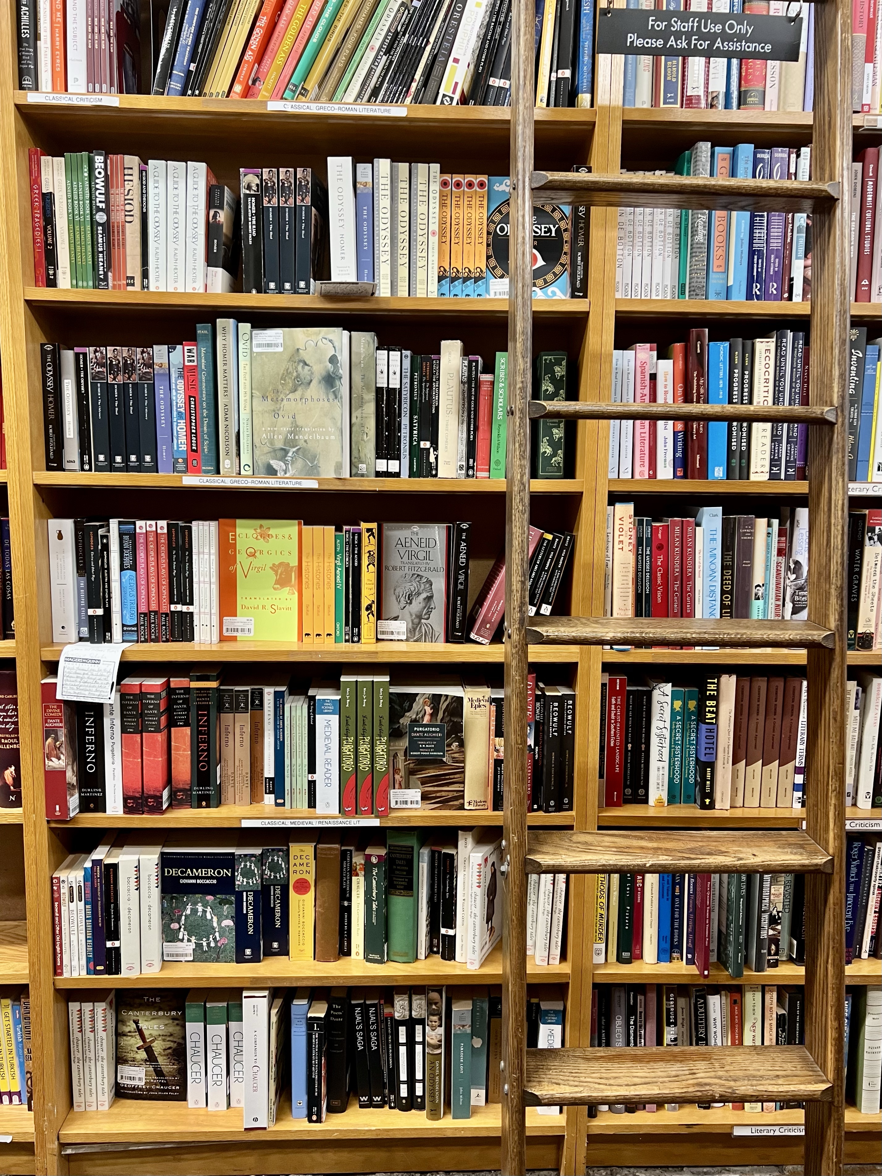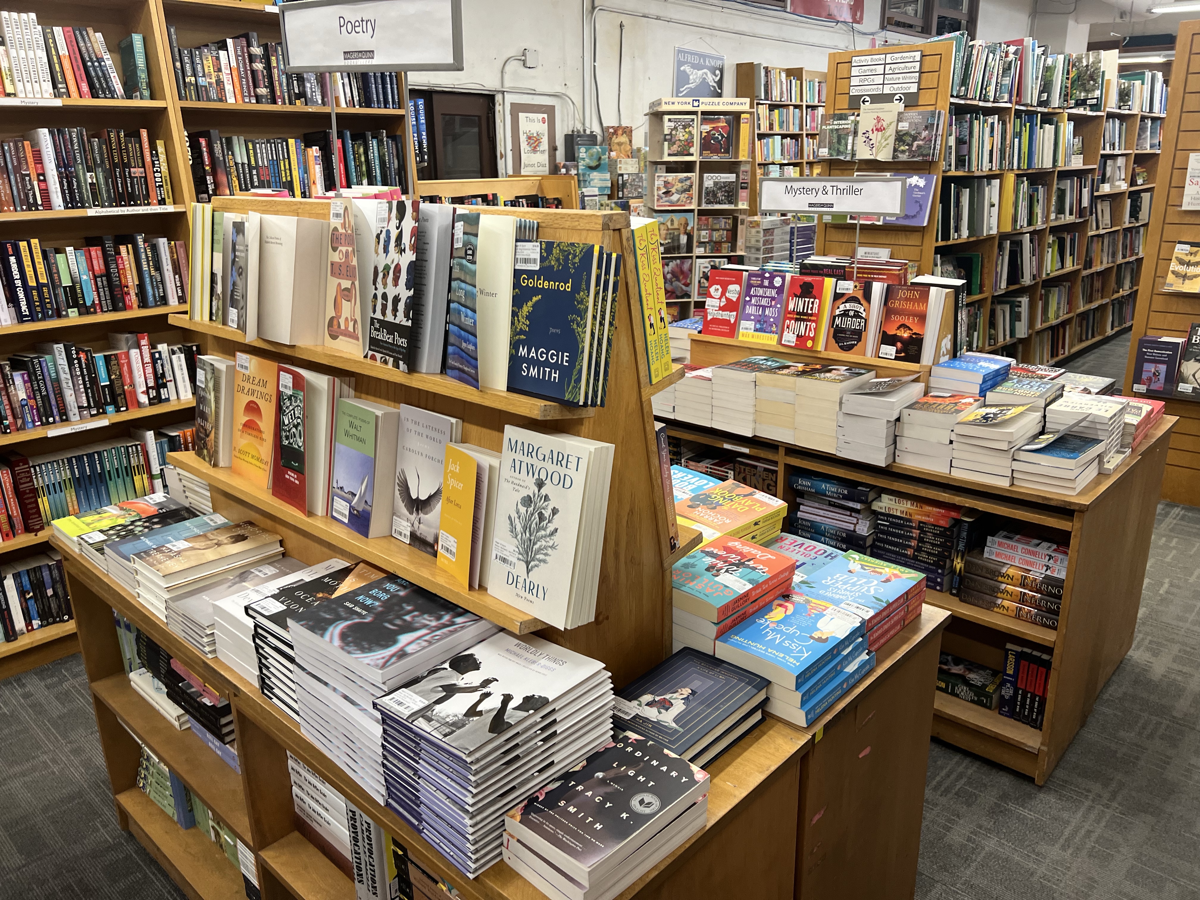 The display tables are sprinkled haphazardly throughout the store’s floorplan. Upward facing book covers are effectively eye catching. And the poetry display is adjacent to the mysteries- so convenient.