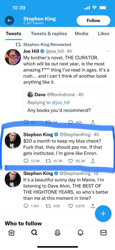 Stephen King says he is having nothing of it. The highlighted tweet has now accumulated half a million likes. The blue check fee is now floating out at $8/mo. Mr. King has not left Twitter yet. So you can see, the situation is still in flux.