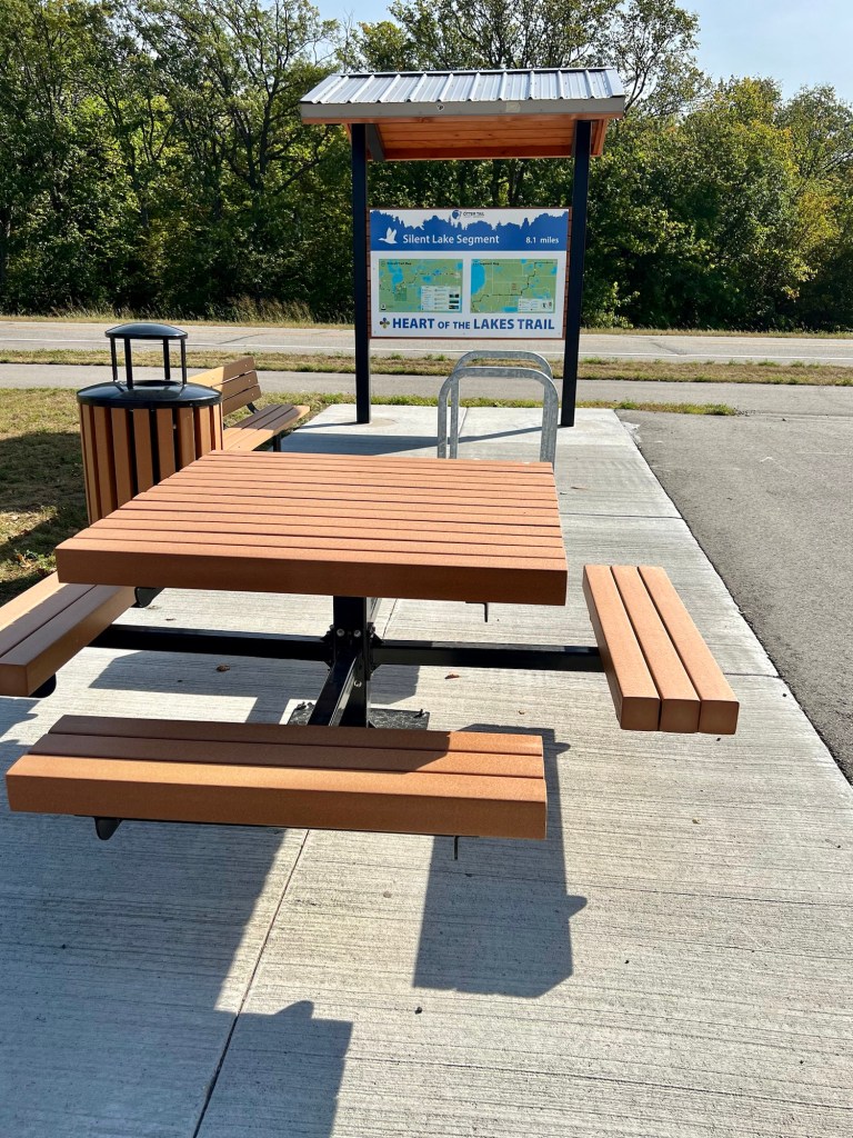 Today’s ride followed some of the new Heart of the Lakes Trail. It doesn’t show up on all the maps yet, so it’s essential to do some research to map out the route. There are excellent services along the way, like mile markers, benches, and trailheads for parking. With a plan in hand we set out for Lakes E-Bikes to pick up our rentals.