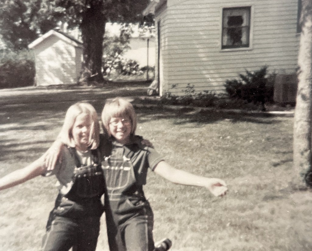 Standing tall in a stork-like embrace with my cousin.