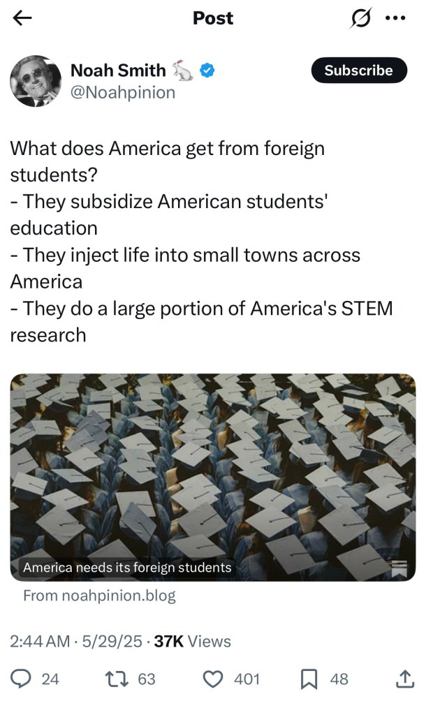 But when 9 out of 10 spots in a phd program are taken by foreign students from an adversarial point of origin across the seas, they are not subsidizing local students they are squeezing them out.