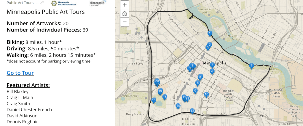 As it turns out, Minneapolis is full of public art–69 installation is all. If you visit Minneapolis you’ll have to check out the self guided tours listed on the Minneapolis Parks and Recreation site. To facilitate planning your tour, there are time estimates for walking, biking or driving. No bike? No worries, Nice Ride has all sorts of stations with bright green bikes you can rent. Here is a screenshot of just the ones in downtown.
