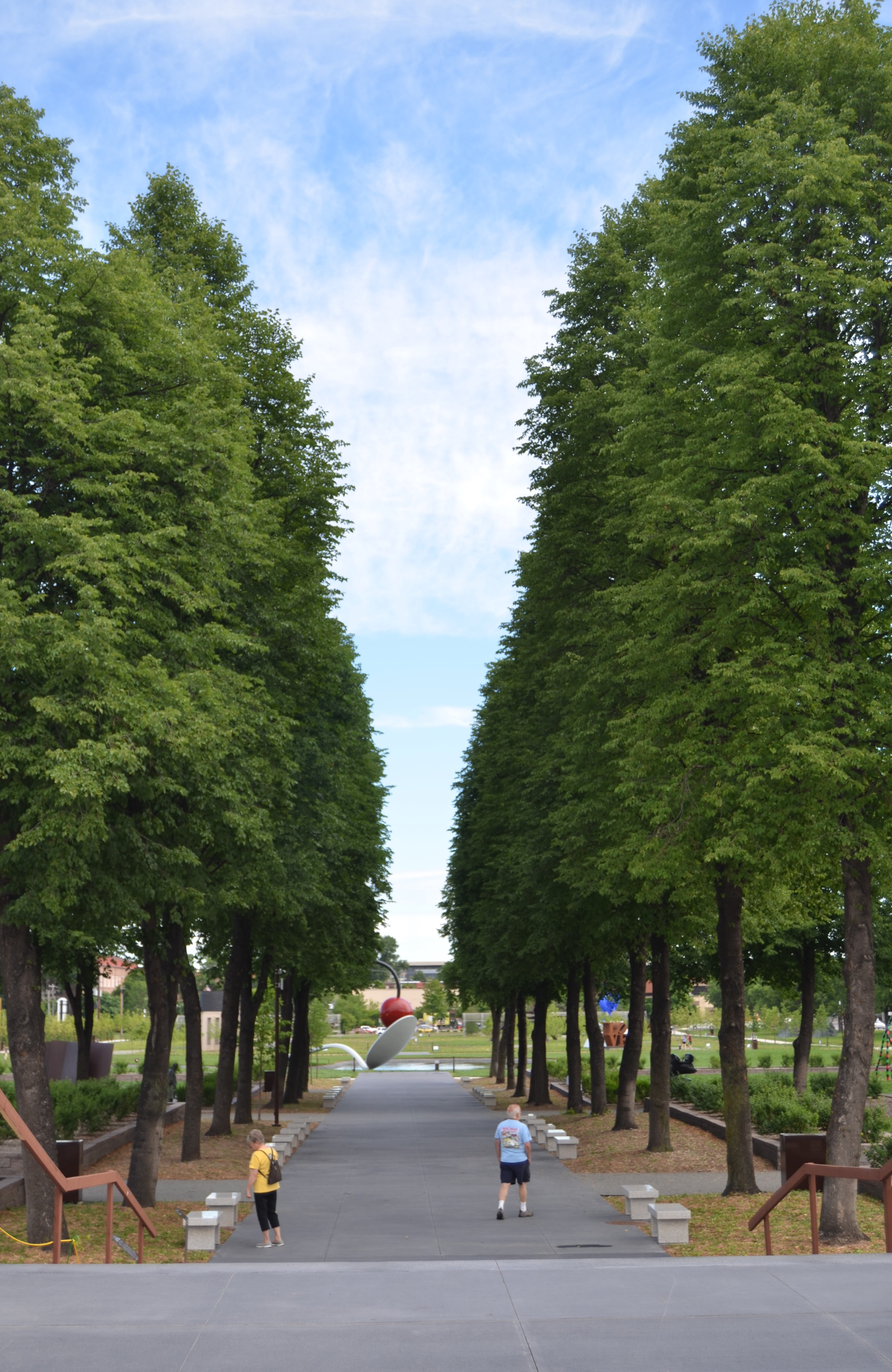 In 2017 the Minneapolis Sculpture Garden, home to the adult male chicken, got a complete overhaul. The garden sits between Parade Stadium and the SW side of downtown, lining up like an elaborate front yard to the Walker Art Center. You can get a glimpse of the blue bird through the garden.