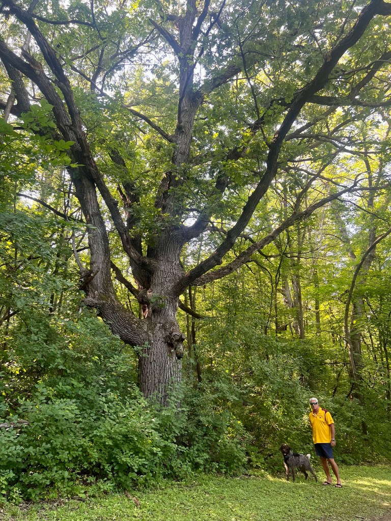 The trail led under a gorgeous canopy tall oak trees. Through all the dead fallen wood you could see a pond down to the left covered in a thick coat of pea green.