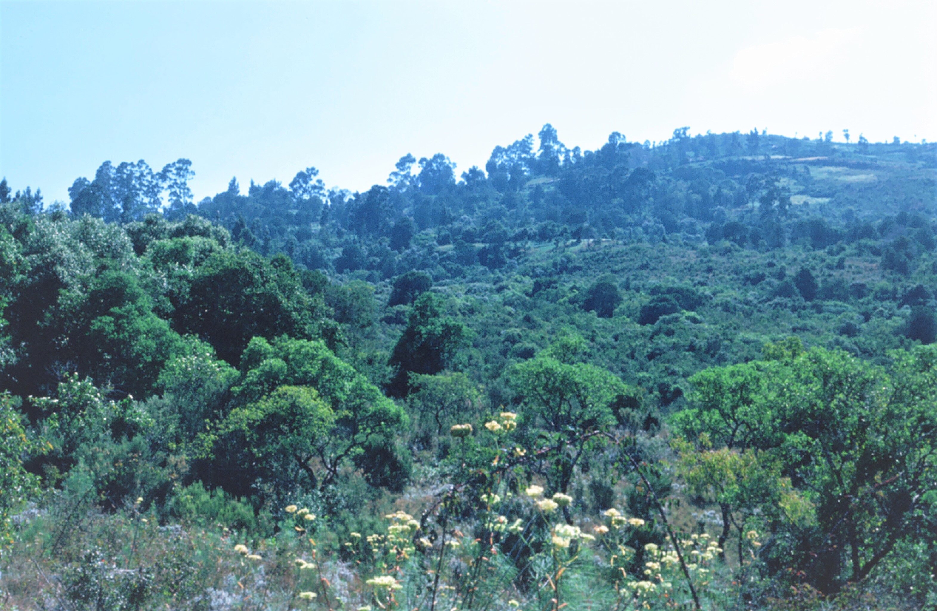 A hike up to the crater lake at Mount Zuqualla is a day trip from Addis Ababa. The drive out of the capital city and off the Ethiopian high plateau, down through the valley to the base of the extinct volcano can be done in less than a couple of hours. It is a bit of a climb up to the lake, and the road is rough. The verdure is thick right after the rainy season, and yellow flowers, similar to our tickseed, bloom throughout the countryside. Silhouetted on the ridge of the hill are oversized eucalyptus trees. They grow everywhere in the highlands and their fragrance is unmistakable.