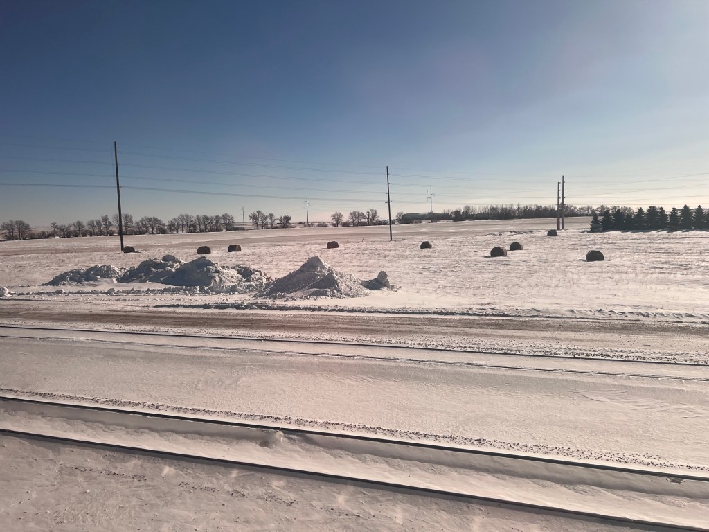 Riding the Amtrak Empire Builder from Union Depot in St. Paul MN to Whitefish MT across the northern plains. A sparse landscape especially in the below zero temps.